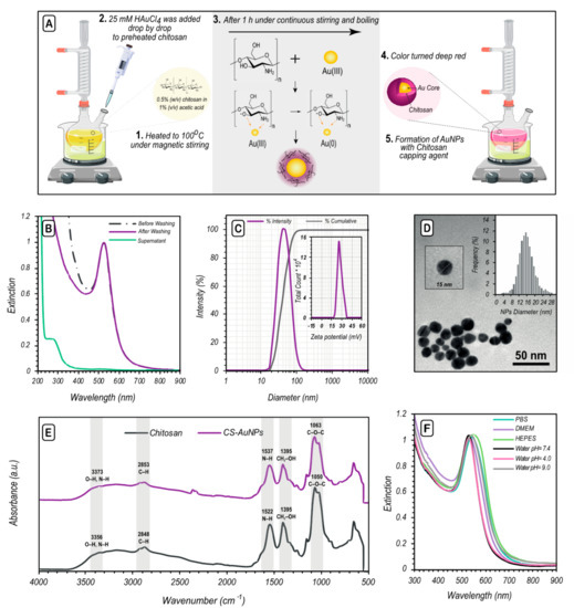 In order to confirm the presence of chitosan on the surface of CS-AuNPs, we characterized the obtained NPs by Fourier-transform infrared (FTIR) spectroscopy as shown in Figure 1E. The characteristic bands of chitosan (3373 cm−1 = N-H, O-H stretching band, 2853 cm−1 = C-H stretching band, 1537 cm−1 = N-H, and 1063 cm−1 = C-O stretching band) [43,44] could indeed be observed in the CS-AuNPs infrared spectrum.