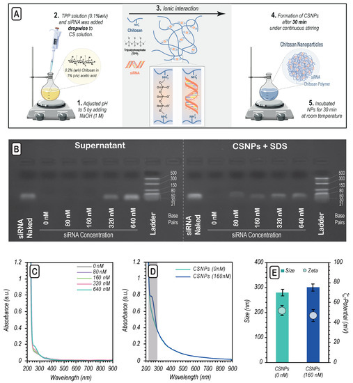Synthesis of crosslinked CSNPs for siRNA delivery, (A) Schematic representation of CSNPs synthesis with the crosslinking method. (B) Agarose gel retardation assay of CSNPs with siRNA as a function of siRNA concentration. (C) UV-Visible spectra of the supernatant obtained after centrifugation, for CSNPs loaded with different amounts of siRNA. (D) UV-Visible spectra of CSNPs prepared in the absence or presence of 160 nM siRNA. (E) Average hydrodynamic particle diameter and zeta-potential of CSNPs with or without siRNA.