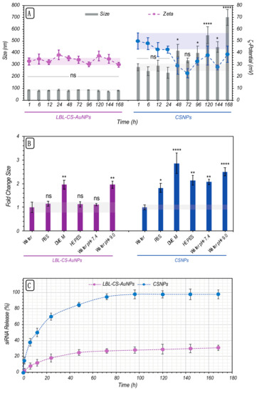 Comparison of siRNA release and colloidal stability between LBL-CS-AuNPs and CSNPs. (A) Size and zeta potential analysis in DDI water as a function of time for LBL-CS-AuNPs and CSNPs. (B) The fold change in particle size of LBL-CS-AuNPs and CSNPs in different media is shown as measured after 1 h incubation. (C) Percentage of siRNA released from LBL-CS-AuNPs and CSNPs in pH 7.4 HEPES buffer at 37 °C as a function of time. Data are represented as mean ± the standard error of the mean for a minimum of three independent experiments. Statistical significance, with respect to water, is indicated when appropriate (ns = not significant p > 0.05, * p ≤ 0.05, ** p ≤ 0.01, **** p ≤ 0.0001).