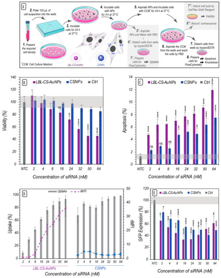Comparison of siRNA Delivery, gene silencing efficiency and cytotoxicity between LBL-CS-AuNPs and CSNPs. (A) Schematic representation of the protocol used to evaluation of NPs as siRNA-delivery-carrier. (B) Cell viability for different effective concentrations of siRNA was measured by CellTiter-Glo® assay after 4 h incubation with LBL-CS-AuNPs (siRNA:Au 1:10) and CSNPs. (C) Apoptosis for different concentrations was assessed based on mitochondrial integrity using DiIC1(5) and PI staining. (D) Uptake percentage (= % positive cells) and relative mean fluorescence intensities of AF647 siRNA labeled LBL-CS-AuNPs on H1299-eGFP cells were determined by flow cytometry. (E) The percent of GFP expression on H1299-eGFP cells was measure based on the mean GFP fluorescence intensity (MFI) of the cell by flow cytometry at different concentrations of LBL-CS-AuNPs loaded with GFP-siRNA. Data are represented as mean ± the standard error of the mean for a minimum of three independent experiments. Statistical significance, with respect to the not treated control (NTC), is indicated when appropriate (ns = not significant p > 0.05, * p ≤ 0.05, ** p ≤ 0.01, *** p ≤ 0.001, **** p ≤ 0.0001).
