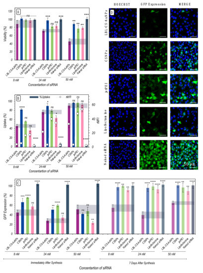 Evaluating the cytotoxicity, uptake and knockdown efficacy of LBL-CS-AuNPs and CSNPs in comparison with jetPEI® and Lipofectamine as commercial transfection reagents for siRNA. (A) Cell viability was measured by CellTiter GLO assay after 4 h incubation with the different carriers at three effective siRNA concentrations (8 nM, 24 nM, and 50 nM). (B) Uptake percentage (= % pos-itive cells) and relative mean fluorescence intensities of AF647 siRNA labeled carriers on H1299-eGFP cells were determined by flow cytometry. (C) Percentage of eGFP expression on H1299-eGFP cells treated with the different carriers at three effective siRNA concentrations (8 nM, 24 nM, and 50 nM) for both freshly and 7 days after synthesis. (D) Confocal images of H1299-eGFP cells after treatment with different carriers at 24 nM effective concentration of siRNA. The nuclei stained with Hoechst 33,342 are shown in blue and the eGFP expression is shown in green in the fluorescence images. The scale bars correspond to 50 μm. Data are represented as mean ± the standard error of the mean for a minimum of three independent experiments. Statistical signifi-cance, with respect to LBL-CS-AuNPs, is indicated when appropriate (ns = not significant p > 0.05, * p ≤ 0.05, ** p ≤ 0.01, *** p ≤ 0.001, **** p ≤ 0.0001).