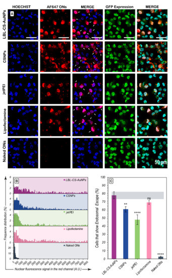 Representative microscopy images obtained after 24 h can be seen in Figure 7A for LBL-CS-AuNPs, CSNPs, Lipofectamine, jetPEI®, and free AF647 ONs at an effective ON concentration of 24 nM. The presence of red fluorescent nuclei in the microscopy images (Figure 7A) confirmed that endosomal escape took place after incubation with every carrier. Frequency distributions of the nuclear fluorescence signal in the red channel of all H1299 cells per condition, quantified from the confocal images (Figure 7B). The percentage corresponding to the percentage of cells with red nuclei in which escape has happened was calculated by analysis of at least 500 cells from 20 images for each sample, showing endosomal escape in 78%, 60%, 48%, and 69% of the cells for LBL-CS-AuNPs, CSNPs, jetPEI®, and Lipofectamine, respectively (Figure 7C). These percentages show that endosomal escape occurred most efficiently for LBL-CS-AuNPs and Lipofectamine-treated cells, in line with the transfection results.