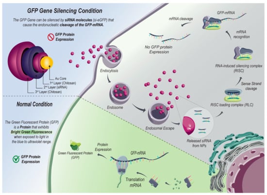 Schematic representation of LBL-CS-AuNPs for siRNA delivery. Under normal conditions, H1299-eGFP cells continuously express enhanced Green Fluorescent Protein (eGFP). When LBL-CS-AuNPs are taken up by cells via endocytosis, chitosan can induce endosomal escape. Then, the released siRNA (si-eGFP) is processed by the RNA-induced silencing complex (RISC), which targets and cleaves GFP-mRNA. The cleavage of GFP-mRNA leads to decreased GFP expression and a diminished green fluorescence intensity of H1299-eGFP cells.