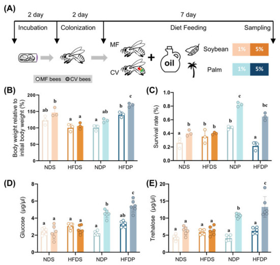 After 4 hours of starvation, bees were fed with carbohydrate, protein, and lipid sources for the diets. The normal diet included 50% (w/v) sucrose, 2% (w/v) casein amino acid and 1% (v/v) soybean oil (NDS) or palm oil (NDP), which was designed based on published literature and beekeeping practices to supply a spartan diet without substantial detrimental effects [50,51]. The high-fat diets contained an increased lipid level to 5% soybean oil (HFDS) or palm oil (HFDP). During this study, the diets were checked every 2 days to make sure each colony had an adequate dietary supply. Each bee was immobilized at 4 °C, and the whole-body wet weight of each bee was measured with an electric balance sensitive to 0.001 g. Following 7 days of these diet treatments, each bee was immobilized at 4 °C, the whole-body wet weight of each bee was measured with an electric balance sensitive to 0.001 g, whole guts and lipid bodies were dissected using fine-tipped forceps, blood hemolymph was collected, and RNA was extracted.