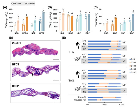 HFD-fed honey bees caused adipose fat accumulation. (A) TAG (triglycerides) concentration of the whole body of MF (n= 3) and CV (n = 3) honey bees from different diet groups. (B) Total TFA (total fatty acid) levels of the whole body of honey bee individuals (n = 3). (C) The ratio of TAG/TFA. (D) HE staining of control and HFD-fed bee fat bodies. Lipid droplets are marked using black arrows. The scale bar (bottom right) represents 10 µm. (E) Composition of SFAs (saturated fatty acids; C16:0, C18:0) and UFAs (unsaturated fatty acids; C18:1, C18:2, C18:3) in TAG and TFA of honey bees. The fatty acid composition of the soybean and palm oil used here was also quantified. Significant differences between dietary groups were determined by one-way ANOVA with Tukey’s multiple comparisons test.