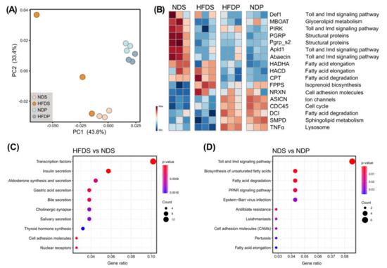 Transcript-level expression analysis of the gut epithelial of honey bees from different dietary groups. (A) PCoA (principal coordinate analysis) of the RNA-seq data from the gut epithelial cells of honey bees (n = 3) collected from different dietary groups. (B) Heatmap displaying DEGs (differentially expressed genes) among four different experimental groups, showing the expression profiles of each dietary fat cluster as indicated on top. The expression of genes are colored from blue to red according to the expression level from low to high. Each column represents one bee individual sample. (C) Representative enriched KEGG pathways on a HFDS (high-fat diet, soybean oil), compared to NDS (normal diet, soybean oil). (D) Representative enriched KEGG pathways on a NDS, compared to NDP (normal diet, palm oil).