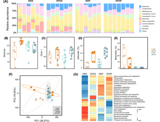 Changes in the composition and functional potential of the bee gut microbiota after ND (normal diet) and HFD intervention in each group. (A) Bar graph of bacterial abundance at the genus level. Genomic DNA was extracted from the gut samples taken from honey bee maintained for 7 days on different dietary diets. Samples were analyzed for the bacterial composition by sequencing of the bacterial 16S rRNA fragments (n = 6). (B) α-Diversity at genus level estimated by Chao1 richness index. (C) Shannon diversity estimator. (D) The relative abundance of Gilliamella in the bee gut. (E) The relative abundance of Bartonella in the bee gut. (F) PCA plot describing functional inferences (PICRUSt) of bacterial communities across dietary fat treatments. (G) Heatmap displaying the differentially enriched KEGG pathways (Level 2) prediction by PICRUSt across dietary groups.