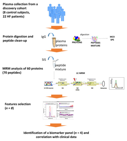 Here, we developed a multiplexed targeted liquid chromatography mass spectrometry (LC-MS)-based assay to quantitatively measure multiple plasma proteins with potential roles in cardiovascular diseases, and we applied it to a cohort of HF patients to identify potential biomarkers of HF severity. The workflow of this study is summarized in Figure 1.
