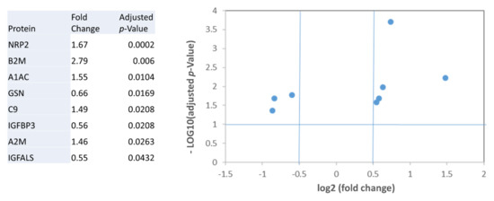 Differentially expressed proteins in patients with severe HF (VO2/Kg < 12 mL/min/Kg) in relation to control subjects. Table and graphical representation in a Vulcano plot of the fold changes, and statistical significance for the proteins with different levels after adjustment for multiple testing.
