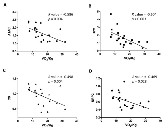 To better clarify the link between the selected features and HF severity, we evaluated the linear correlation of the 5 selected features with the levels of VO2/Kg, and demonstrated a significant inverse correlation for A1AC (R-value = −0.586, p = 0.004), B2M (R-value= −0.604, p = 0.003), C9 (R-value = −0.498, p = 0.018) and NRP2 (R-value = −0.469, p = 0.028) (Figure 3), while gelsolin did not result significantly correlated with the levels of VO2/Kg. Of note, only the correlation between B2M and the levels of VO2/Kg was independent from the levels of B-type natriuretic peptide (BNP).