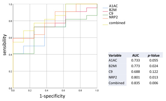 To assess if these proteins were differentially expressed in patients with different HF severity, we performed an ANOVA, including low severity HF patients (VO2/Kg > 16 mL/min/Kg), medium severity HF patients (12 < VO2/Kg <16 mL/min/Kg), and high severity HF patients (VO2/Kg < 12 mL/min/Kg). We identified NRP2, B2M, A1AC, GSN, C9, as significantly different among groups (Table 1). These data were also confirmed with a general linear model, adjusting for age, due to the differences among groups for this variable (Tables S1 and S3).