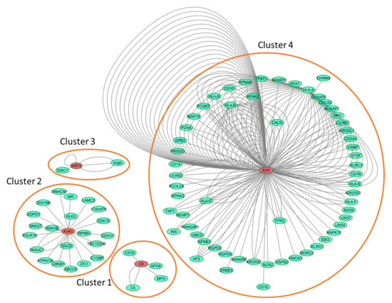 To contextualize the four identified potential biomarkers, we created a human protein interaction network of the features and their interactors with Intact, including 220 binary interactions between 91 interactors (Figure 5). A gene ontology enrichment analysis performed with String highlighted the involvement of the majority of the interactors in the regulation of the immune system process (p = 4.57 × 10−12). More specifically, proteins belonging to cluster 4 are mainly involved in the regulation of the immune response (p = 1.38 × 10−11), while those from cluster 2 regulates signaling (p = 9.26 × 10−5) and cell communication (p = 9.26 × 10−5), while those from cluster 1 regulate the inflammatory response (p = 0.0043).