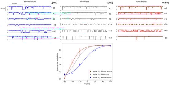 (Upper): the samples of the original ionic currents of single mitoBK channels for three different cell types: endothelium (blue); fibroblast (gray); hippocampus (red). (Lower): the average probability of channel opening at different membrane potentials fitted by sigmoidal curves.