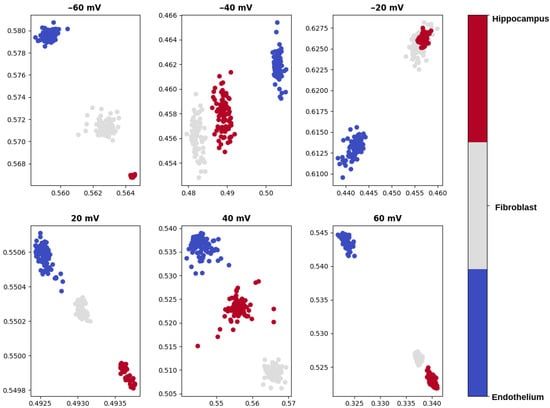 To give some quantitative measure of distances between the clusters emerging in the 2-dimensional latent space (representing different cellular lines) we applied the K-Means clustering. Due to the fact that in our analysis there were 3 independent cell lines, we set the value of . After finding the cluster centers we were able to calculate the average distances between centroids corresponding to the various cells. These results are presented in Table 1 and are denoted as Dist F, Dist FE, Dist HE characterizing distances between the appropriate pairs: fibroblast–hippocampus, fibroblast–endothelium and hippocampus–endothelium, respectively. The average distances in the latent space are the highest between the clusters representing hippocampal and endothelial cells for most membrane potentials (excluding = +40 mV). In turn, the clusters representing fibroblasts are located nearer the ones corresponding to the hippocampal cells than the ones corresponding to the endothelial cells for most values of the (The only exception is at = +20 mV, where the distances are comparable). These results indicate that the characteristics of channel activity pattern mostly differ from the other ones in case of the endothelial cells. Based on the obtained results, it is evident that some differences in the dynamics of the investigated groups of mitoBK channels can occur. These differences may be a manifestation of various mechanisms of switching between the channel’s stable conformations (which can be observed in the form of single-channel currents of discernible magnitude and duration).