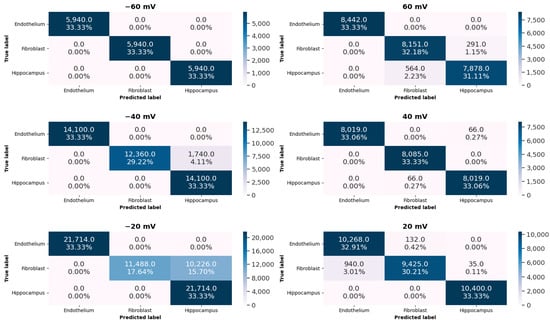 The set of confusion matrices for different pipette potentials. The values given in each block of the confusion matrices indicate the number and percentage of samples classified in a given category. Please note that the overall number of samples for each potential is different, but it is equally distributed among three cell lines.