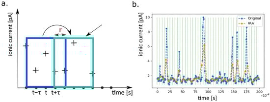 (a) Illustration of the time series split. In the current analysis the . (b) A schematic representation of the PAA method. Each original subseries of 1000 data points (which corresponds to the time interval of 0.1 s at the applied sampling rate of 10 kHz) is “compressed” to the series of 200 points by the PAA algorithm of dimensionality reduction. Here, for clarity we presented the dimensionality reduction performed on the original subseries of 200 points (corresponding to the time interval 0.02 s). As one can see, application of PAA algorithm allow the retention of the main features of the original input series.