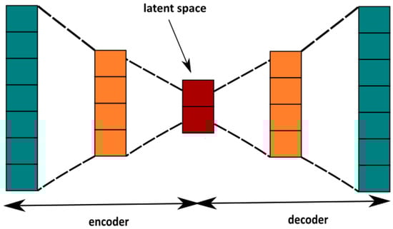The scheme of autoencoder. The green squares stand for the input data, the orange ones indicate the intermediate layer of neurons. The red squares denote the latent space and provide the reduced representation of the sample.