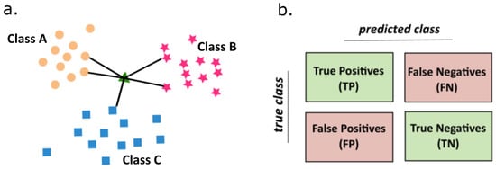 (a) Representation of K-nearest neighbors algorithm: general scheme of algorithm, (b) illustration of confusion matrix.