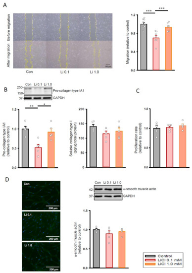 As shown in Figure 1A, lithium (0.1 mM)-treated cardiac fibroblasts exhibited a lower migration ability when compared with the control and the lithium (1.0 mM)-treated cardiac fibroblasts. In addition, lithium (0.1 mM)-treated cardiac fibroblasts had a lower production of pro-collagen type IA1 than the control (Figure 1B). However, the control and lithium (0.1 mM)-treated fibroblasts did not have a significant difference in soluble collagen type I amount. In addition, lithium (0.1 mM)-treated fibroblasts had similar proliferation rate (Figure 1C), expression of α-smooth muscle actin (Figure 1D), and cell size (Supplementary Figure S1) as compared to the control and lithium (1.0 mM)-treated human cardiac fibroblasts.