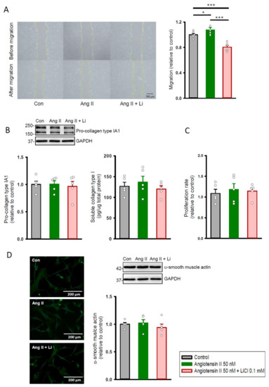 Cell migration, proliferation, and collagen synthesis abilities of human cardiac fibroblasts with and without LiCl/angiotensin II treatment for 24 h. (A) Photograph and graph presenting mean data of the migration assay in human cardiac fibroblasts (n = 6 from three independent experiments). (B) Photograph and bar graph presenting average data of the pro-collagen type IA1 (n = 5 from three independent experiments) and soluble collagen type I (n = 5 from three independent experiments) production in human cardiac fibroblasts. (C) Average data of the proliferation rate in the cardiac fibroblasts (n = 5 from three independent experiments). (D) Photograph of immunofluorescence microscopy imaging and graph presenting average data of the α-smooth muscle actin expression on Western blot (n = 5 from three independent experiments). GAPDH was used as a loading control. One-way repeated measures analysis of variance (ANOVA) test with Tukey’s post hoc test was used to compare the human cardiac fibroblasts under different treatment conditions. * p < 0.05, *** p < 0.001.