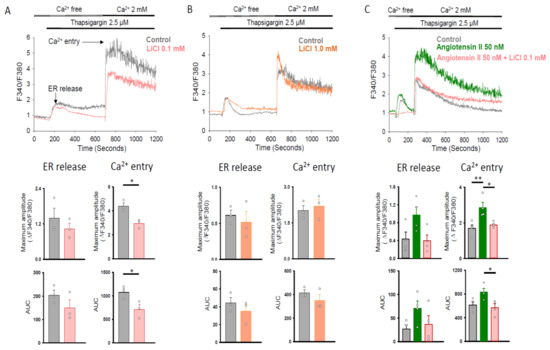 Store-operated Ca2+ entry in human cardiac fibroblasts with and without LiCl/angiotensin II treatment for 24 h. Representative tracings and average data of the maximum amplitude and AUC of the intracellular Ca2+ concentration in Fura-2 AM-loaded human cardiac fibroblasts following the removal of extracellular Ca2+, the addition of the sarco/ER Ca2+-ATPase inhibitor thapsigargin (2.5 μM), and the re-addition of extracellular Ca2+ (2 mM). Panel (A) shows that LiCl (0.1 mM)-treated cells had a similar maximum amplitude and AUC of ER release and a lower maximum amplitude and AUC of Ca2+ entry than the control cells (n = 3 independent experiments). Panel (B) shows that LiCl (1.0 mM) and control cells had a similar maximum amplitude and AUC of ER release and Ca2+ entry (n = 3 independent experiments). Panel (C) shows that angiotensin II (50 nM)-treated cells had a larger maximum amplitude of Ca2+ entry than the control cells. Combined lithium (0.1 mM) and angiotensin II (50 nM)-treated cells had a smaller maximum amplitude and AUC of Ca2+ entry compared to the angiotensin II (50 nM)-treated cells (n = 4 independent experiments). Unpaired t test, Mann–Whitney rank-sum test, and one-way analysis of variance (ANOVA) test with Tukey’s post hoc test were used to compare the ER release and Ca2+ entry under different treatment conditions. * p < 0.05, ** p < 0.01.
