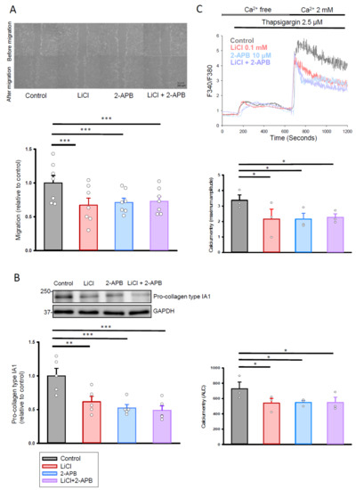 In conclusion, the results of this study suggest that, at therapeutic trough levels, lithium reduces the migration and collagen synthesis ability of human cardiac fibroblasts through its inhibitory action on store-operated Ca2+ entry and Orai1 expression. Future research studies are mandatory to apply pro-fibrotic stimulus to investigate lithium’s effects on the multifaceted activities of human cardiac fibroblasts.
