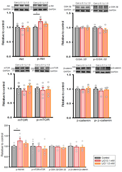 Expression levels of pro-fibrotic signaling proteins in human cardiac fibroblasts with and without LiCl treatment for 24 h. Photograph and graph showing the mean data of expression levels and ratios of Akt, mTOR, GSK-3β, and β-catenin in human cardiac fibroblasts (n = 5 from three independent experiments). GAPDH was used as a loading control. One-way repeated measures analysis of variance (ANOVA) test with Tukey’s post hoc test was used to compare the expression levels of proteins under different treatment conditions. * p < 0.05.