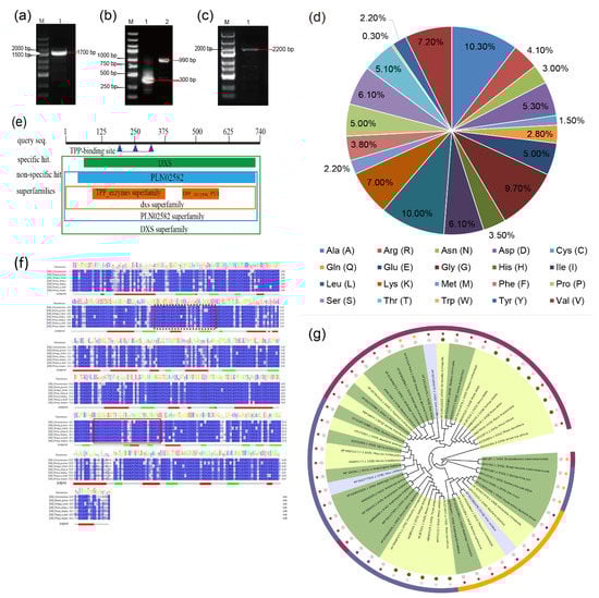 According to the Masson pine transcriptome data [], the DXS gene was cloned and spliced to obtain a full-length sequence of 2513 bp (GenBank accession number: MK970590), including the middle 1709 bp fragment (Figure 1a), 5′RACE 991 bp fragment (Figure 1b), 3′RACE 333 bp fragment (Figure 1b), and 2223 bp ORF region (Figure 1c). In addition, the DXS gene can encode a 740 amino acid protein. The secondary structure of the protein predicted by SOPMA mostly includes random coils, followed by α-helices and β-turns. The physical and chemical properties of the amino acids of the PmDXS gene were analyzed by ProtParam online software. The isoelectric point (pI) was 8.54, the number of total negatively charged residues (Asp+Glu) was 76, and the number of total positively charged residues (Arg+Lys) was 82. The numbers of 20 species and their proportions are shown in Figure 1d. Similar to DXS proteins in other plants, the PmDXS protein is a hydrophilic protein, and it does not contain a transmembrane domain and signal peptide.