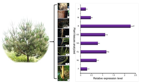 PmDXS expression level in different tissues of P. massoniana. The young leaf tissue was used as a control. Different lowercase letters in the same column indicate a significant difference, p < 0.05.