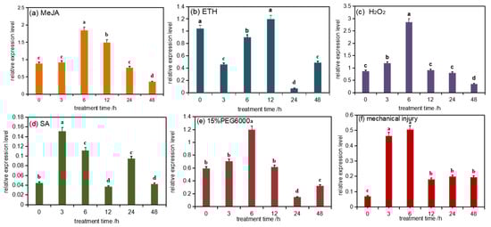 PmDXS expression level in different stress of P. massonniana. Different lowercases in the same column indicate a significant difference, p < 0.05. All the above treatments were treated at 0 h without any treatment as the control group. Figure (a) shows the relative expression level under MeJA treatment; figure (b) shows the relative expression under ETH treatment; figure (c) shows the relative expression under H2O2 treatment; figure (d) shows the relative expression under SA treatment; figure (e) shows the relative expression under 15 % PEG6000 treatment; figure (f) shows the relative expression under mechanical injury treatment.