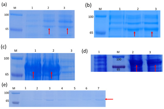 SDS-PAGE analysis of the expressed product of the recombinant strain pET28a-PmDXS. M. Protein molecular weight standard. The molecular weight of the target protein, which is about 70.4 kDa (red arrow). (a). The supernatant of bacterial solution at 16 °C (1. Recombinant strain without IPTG induction). 2. Recombinant strain with 0.5 mM IPTG induction for 16 h. 3. Recombinant strain with 1.0 mM IPTG induction for 16 h). (b). Induction of bacterial solution under 16 °C (1. Recombinant strain without IPTG induction; 2. Recombinant strain with 0.5 mM IPTG induction for 16 h; 3. Recombinant strain with 1.0 mM IPTG induction for 16 h). (c). The precipitate of the bacterial solution at 16 °C (1. Recombinant strain with 0.5 mM IPTG induction for 16 h; 2. Recombinant strain with 1.0 mM IPTG induction for 16 h; 3. Recombinant strain without IPTG induction). (d). Induction of bacterial solution under 37 °C (1. Recombinant strain without IPTG induction; 2. Recombinant strain with 0.5 mM IPTG induction for 4 h; 3. Recombinant strain with 1.0 mM IPTG induction for 4 h). (e). The supernatant of the bacterial solution at 37 °C (1. pET28a strain with 1.0 mM IPTG induction for 4 h; 2~7. Recombinant strain with 0, 0.1, 0.3, 0.5, 1.0, and 2.0 mM IPTG induction for 4 h).