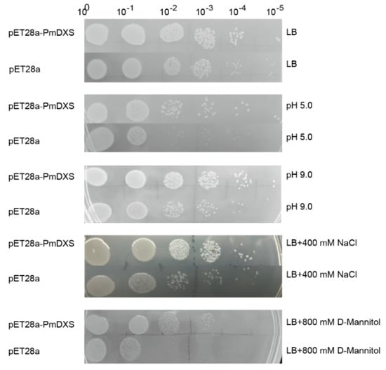Growth status of recombinant and control bacteria on solid LB medium. The recombinant bacteria (TransB/pET28a−PmDXS) and the control bacteria (TransB/pET28a) were inoculated on solid plates containing LB, 400 mM NaCl, 800 mM D-mannitol, HCl (pH 5.0), or NaOH (pH 9.0). All plates were incubated at 37 °C overnight. 100~10−5 represent the dilution gradients of the E. coli liquid culture.