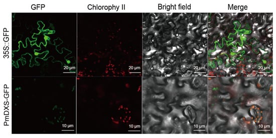 We constructed the pCAMBIA1302 vector containing the GFP (Green fluorescent protein) fluorescence signal, constructed the PmDXS::GFP fusion vector, designed the primer 1302-DXS (Table 1) containing the restriction sites of Nco Ⅰ and Spe Ⅰ, transformed the Agrobacterium competent GV3101, and injected it with a syringe Ben’s tobacco [,]. A laser confocal microscope (LSM710, Zeiss, Germany) was used to observe the GFP signal of the epidermal cells of N. benthamiana, and the image was observed by ZEN Imaging version 2.36 software.