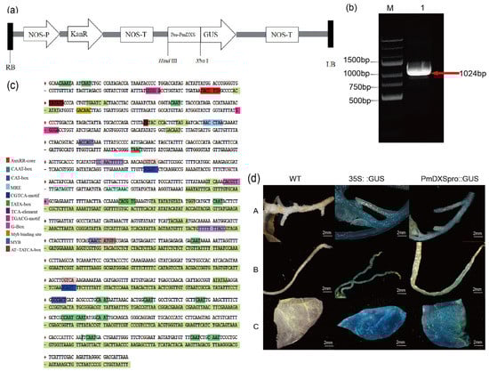 Analysis of the PmDXS promoter sequence and transient expression. (a) Schematic diagram of pBI121-PmDXSpro::GUS vector construction. (b) Cloning and verification of the PmDXS promoter from P. massoniana. M. DNA marker GsDL2502; 1. PCR amplification of PmDXS promoter (red arrow). (c) Nucleotide sequence and predicted cis-acting elements of the PmDXS promoter. (d) Detection of PmDXS promoter activity by transient expression in tobacco (A. Stems of tobacco B. Roots of tobacco C. Leaves of tobacco).
