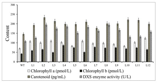 Contents of chlorophyll a, chlorophyll b, and carotenoids and 1-deoxy-D-xylose-5-phosphate synthase (DXS) enzyme activity in the transgenic lines and wild type (WT) A. thaliana.