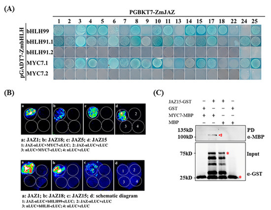 3.2. Screening of COI-JAZ and MYC Protein Complexes Identified ZmCOI1a-ZmJAZ15 as an Essential Module in Maize-Fusarium Interaction
