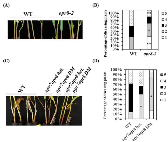 - Yan, Y.; Christensen, S.; Isakeit, T.; Engelberth, J.; Meeley, R.; Hayward, A.; Emery, R.J.; Kolomiets, M.K. Disruption of OPR7 and OPR8 reveals the versatile functions of jasmonic acid in maize development and defense. Plant Cell 2012, 24, 1420–1436. [Google Scholar] [CrossRef]