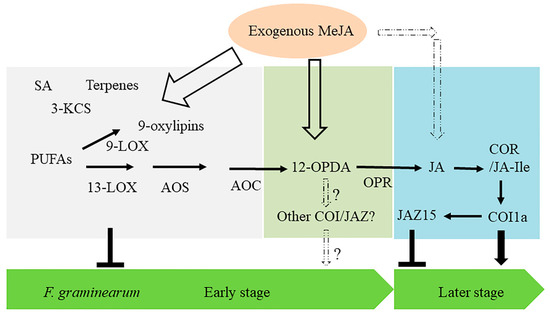 - Sun, Y.X.; Xiao, J.; Jia, X.P.; Ke, P.B.; He, L.Q.; Cao, A.Z.; Wang, H.; Wu, Y.; Gao, X.; Wang, X. The role of wheat jasmonic acid and ethylene pathways in response to Fusarium graminearum infection. Plant Grow. Regul. 2016, 80, 69–77. [Google Scholar] [CrossRef]
