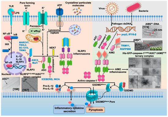 - de Alba, E. Structure, interactions and self-assembly of ASC-dependent inflammasomes. Arch. Biochem. Biophys. 2019, 670, 15–31. [Google Scholar] [CrossRef]