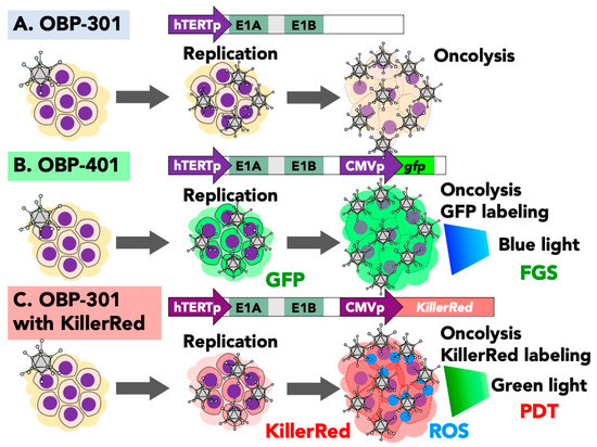 Oncolytic virotherapy is a promising, emerging targeted therapy [14,15,16,17,18,19,20]. We developed three types of cancer-targeting oncolytic adenoviruses that are driven by the hTERT promoter: OBP-301, OBP-401, and OBP-301 with KillerRed (Figure 1). The hTERT promoter, highly expressed in most cancers, drives the adenoviral E1A and E1B genes, which are essential for virus replication. OBP-301 is effective against most solid tumors that have high telomerase activity (Figure 1A) [21,22,23,24,25]. OBP-401 contains the GFP gene, enabling preferential labeling of cancer cells (Figure 1B) [26]. OBP-301 containing KillerRed has been used for photodynamic therapy (PDT) of cancer cells (Figure 1C) [27]. In the present review, we focus on fluorescence-guided oncolytic virotherapy that can decoy quiescent chemoresistant cancer stem cells to cycle and become chemosensitive; fluorescence-guided surgery (FGS) with adenovirus-mediated GFP; and cancer-targeted PDT with adenoviral KillerRed.
