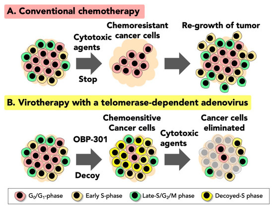Viral therapy with a telomerase-dependent adenovirus is a promising cancer therapeutic strategy. Highlights of telomerase-dependent viral therapy include decoy of quiescent cancer cells to cycle which makes them chemosensitive; FGS and PDT. Phase I clinical trials in the United States showed that OBP-301 was safe for patients with advanced solid tumors [22]. A Phase I clinical study of combination therapy with OBP-301 and radiotherapy has been conducted to confirm safety, tolerability, and feasibility on patients with esophageal cancer in Japan [25]. Future clinical studies will be performed for anti-tumor efficacy with telomerase-dependent adenovirus.