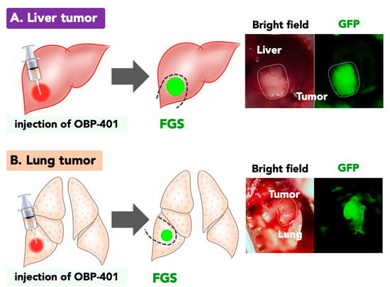 We applied OBP-401 to FGS for metastatic liver tumors and for primary and metastatic lung tumors [92,93] (Figure 4). We first developed an orthotopic solitary metastatic model with a colon cancer cell line by implantation of HCT-116-RFP cells under the serosa of the liver of nude mice [92]. The orthotopic tumor grew extensively in the liver. Intratumoral and intravenous injection of OBP-401 visualized the metastatic liver tumor [92,94]. OBP-401-derived GFP and cancer-cell-derived RFP fluorescence precisely colocalized [92]. OBP-401-GFP enabled illumination and detection of cancer cells at the single-cell level. OBP-401-based FGS resulted in no detectable residual cancer cells in the surgical bed [92].