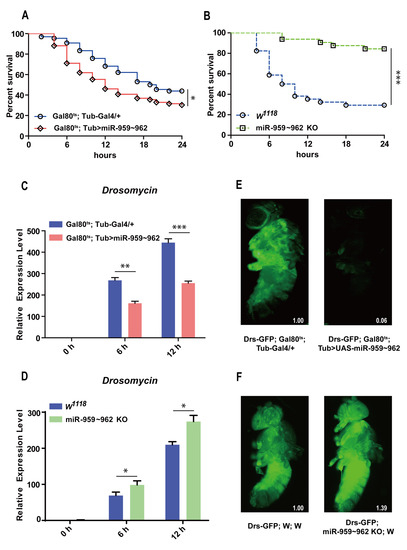 The following are available online at https://www.mdpi.com/1422-0067/22/2/886/s1. Figure S1. The expression levels of miR-959 (A), miR-960 (B), miR-961 (C), and miR-962 (D) in control flies and miR-959–962 cluster high-expressing fly strains were measured before M. luteus infection. Figure S2. The expression levels of miR-959 (A), miR-960 (B), miR-961 (C), and miR-962 (D) were measured in control flies (w1118) and miR-959–962 cluster knock-out fly strains before M. luteus infection. Figure S3. The expression levels of miR-959 in miR-959 high-expressing flies (A), miR-960 in miR-960 high-expressing flies (B), miR-961 in miR-961 high-expressing flies (C), and miR-962 in miR-962 high-expressing flies (D) were respectively measured before M. luteus infection. Table S1. Primers used for quantitative RT-PCR. Table S2. Primers used for transgene vector construction.