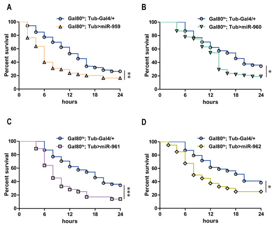 Each of miRNA member from miR-959–962 clusters influences the survival of Drosophila. The changes of the survival rate were observed in miR-959 high-expressing flies (A), miR-960 high-expressing flies (B), miR-961 high-expressing flies (C) and miR-962 high-expressing flies (D), as well as the control flies upon E. faecalis infection. (* p < 0.05; ** p < 0.01; *** p < 0.001).