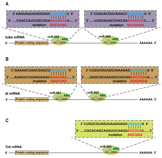 The target genes of four miRNA members from miR-959–962 clusters were predicted. The potential binding sites of miR-959, miR-960, miR-961, and miR-962 in the 3′ UTR of tube (A), dl (B) and Toll (C) were present, respectively. The point mutations (red) at the 3′ UTR target sites base pairing to the seed sequence of corresponding miRNA (blue) were performed.