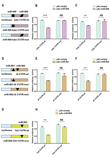 The direct bind between four miRNA members from miR-959–962 cluster and its target genes were confirmed by Dual luciferase reporter assay in vitro. (A,D,G) The schematic diagrams of construction of targets 3′ UTR and 3′ UTR mutation luciferase reporter plasmids were presented. After co-transfected with miRNA expression plasmid, the corresponding luciferase activity of the report plasmids without or with mutation sites was determined in Drosophila S2 cell on a Dual luciferase assay (B,C,E,F,H). (** p < 0.01; *** p < 0.001; and ns, no significance vs. the control).