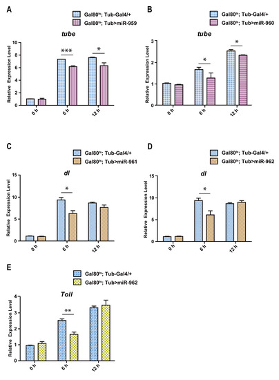 Four miRNA members from miR-959–962 cluster inhibit the expression of its target genes in vivo. The expression levels of tube were respectively tested in miR-959 high-expressing (A) and miR-960 high-expressing flies (B). (C,D) The expression levels of dl in miR-961 high-expressing and miR-962 high-expressing flies were respectively tested. (E) The expression level of Toll in miR-962 high-expressing flies was detected. (* p < 0.05; ** p < 0.01; *** p < 0.001).