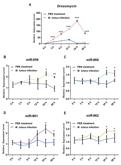 The temporal expression patterns of four miRNAs in the wild-type flies prior to and following M. luteus infection. The dynamic expression changes of Drs (A), miR-959 (B), miR-960 (C), miR-961 (D), miR-962 (E) at six time-points (0, 3, 6, 12, 24, and 48 h) prior to and following M. luteus or PBS infection, respectively. (* p < 0.05; ** p < 0.01; *** p < 0.001; and ns, no significance vs. the control).