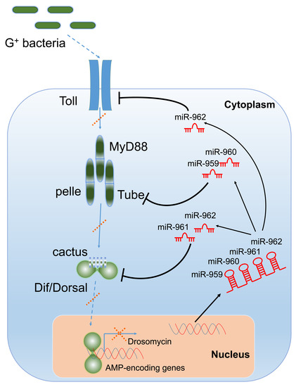 - Li, S.; Xu, J.; Sun, L.; Li, R.; Jin, P.; Ma, F. Drosophila miR-964 modulates Toll signaling pathway in response to bacterial infection. Dev. Comp. Immunol. 2017, 77, 252–258. [Google Scholar] [CrossRef]