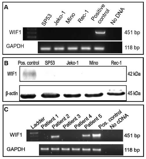 To examine the expression of WIF1 in MCL, we performed RT-PCR and Western blot studies. As shown in Figure 1A,B, WIF1 mRNA and WIF1 protein were not detectable in all 4 MCL cell lines examined, including SP53, JeKo-1, Mino, and Rec1. Using RT-PCR to detect WIF1 mRNA in 5 cases of MCL tumors from previously untreated patients, WIF1 expression was detected in only 2 out of the 5 (40%) samples (Figure 1C).